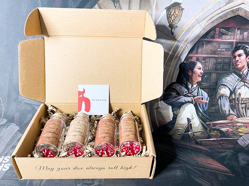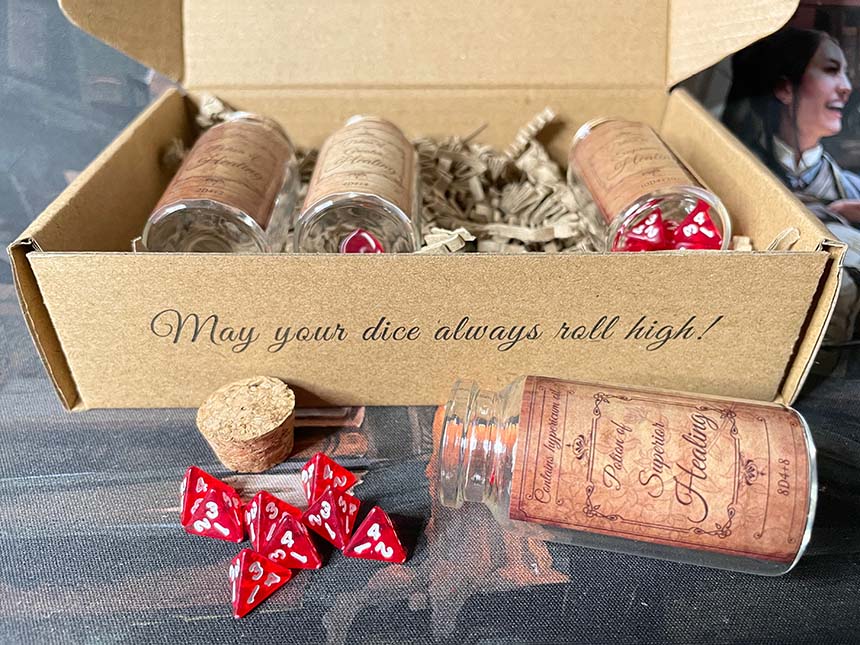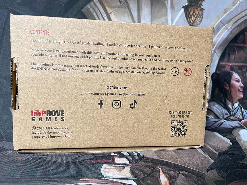 Dungeons & Dragons è il gioco di ruolo più famoso e giocato del mondo. Improve Games ha creato delle pozioni di guarigione che riproducono in maniera materiale e visiva un meccanismo del gioco. Se un personaggio ha una pozione di guarigione può utilizzarla per recuperare punti ferita.